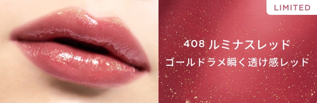 - スクワラン、リンゴ酸ジイソステアリル、(イソステアリン酸ポリグリセリル-2/ダイマージリノール酸)コポリマー、ダイマージリノール酸(フィトステリル/イソステアリル/セチル/ステアリル/ベヘニル)、イソノナン酸イソトリデシル、水添ポリイソブテン、トリ(カプリル酸/カプリン酸)グリセリル、ラウロイルグルタミン酸ジ(フィトステリル/オクチルドデシル)、合成ワックス、パラフィン、ダイマージリノール酸ジ(イソステアリル/フィトステリル)、マイクロクリスタリンワックス、水酸化Al、ジメチコン、トコフェロール、酸化スズ、酸化チタン、金、酸化鉄、ホウケイ酸(Ca/Al)、赤201、赤202、赤223、橙201、黄4、青1